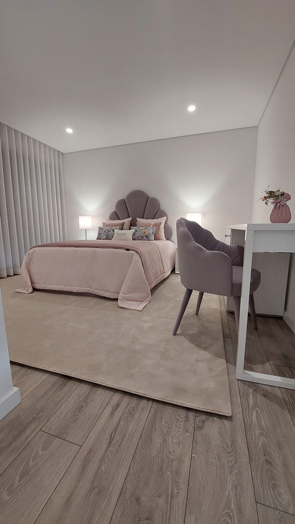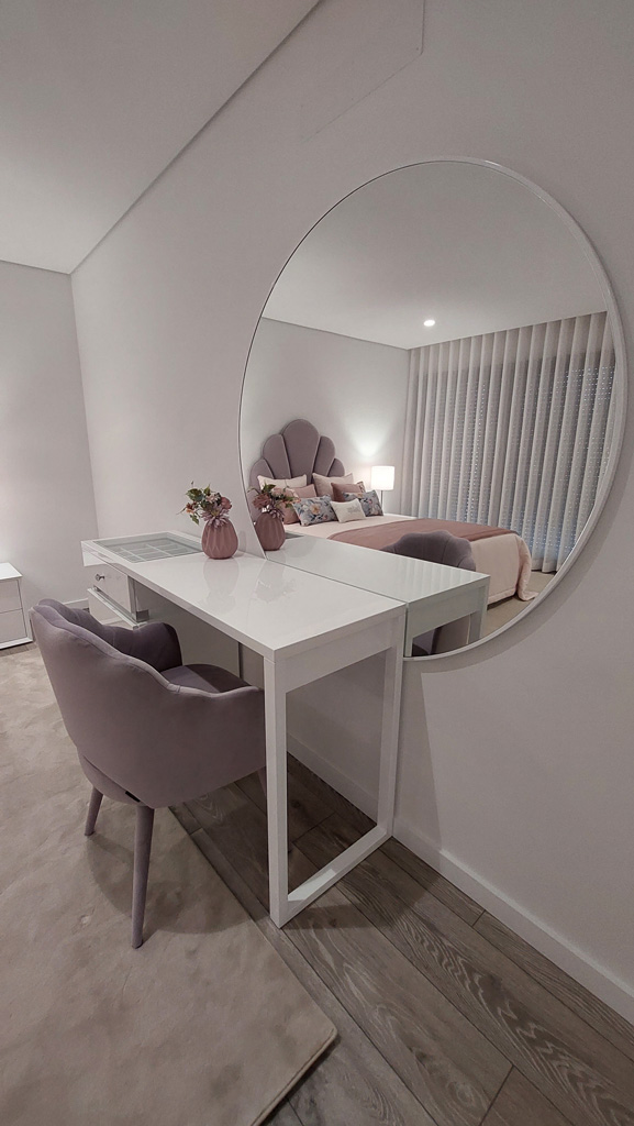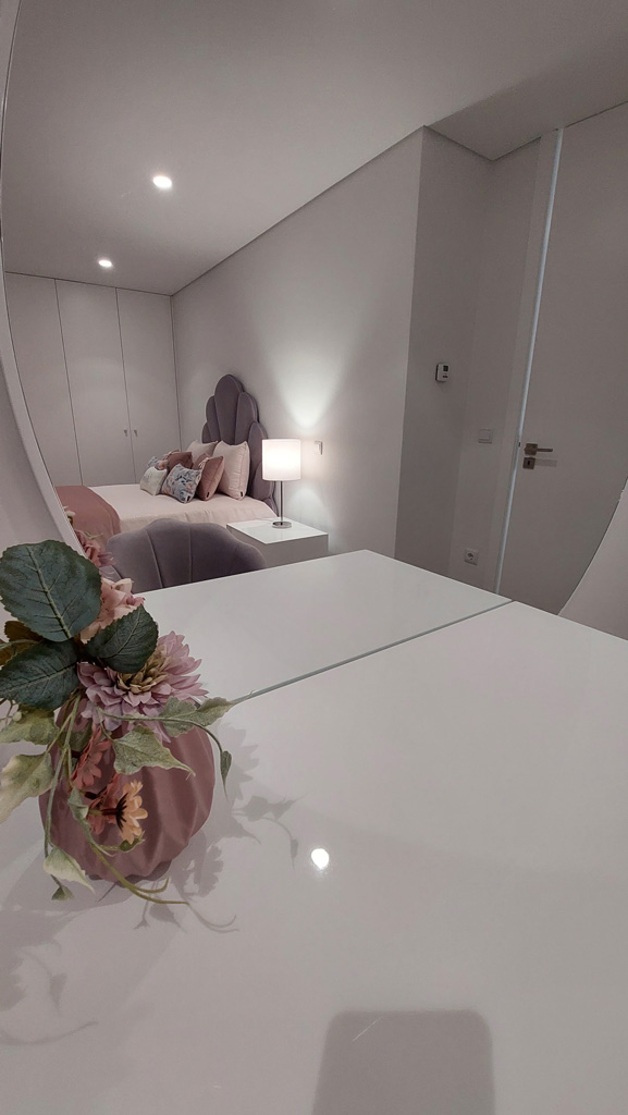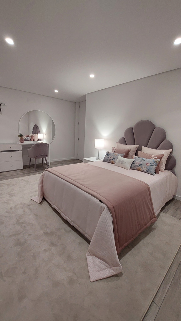 A decoração com móveis brancos por medida promove muitas possibilidades, já que a neutralidade da cor permite muitas combinações. Não esquecemos ainda o poder dos cortinados da tapeçaria e da decoração da cama na qual tudo foi escolhido ao pormenor e confeccionado